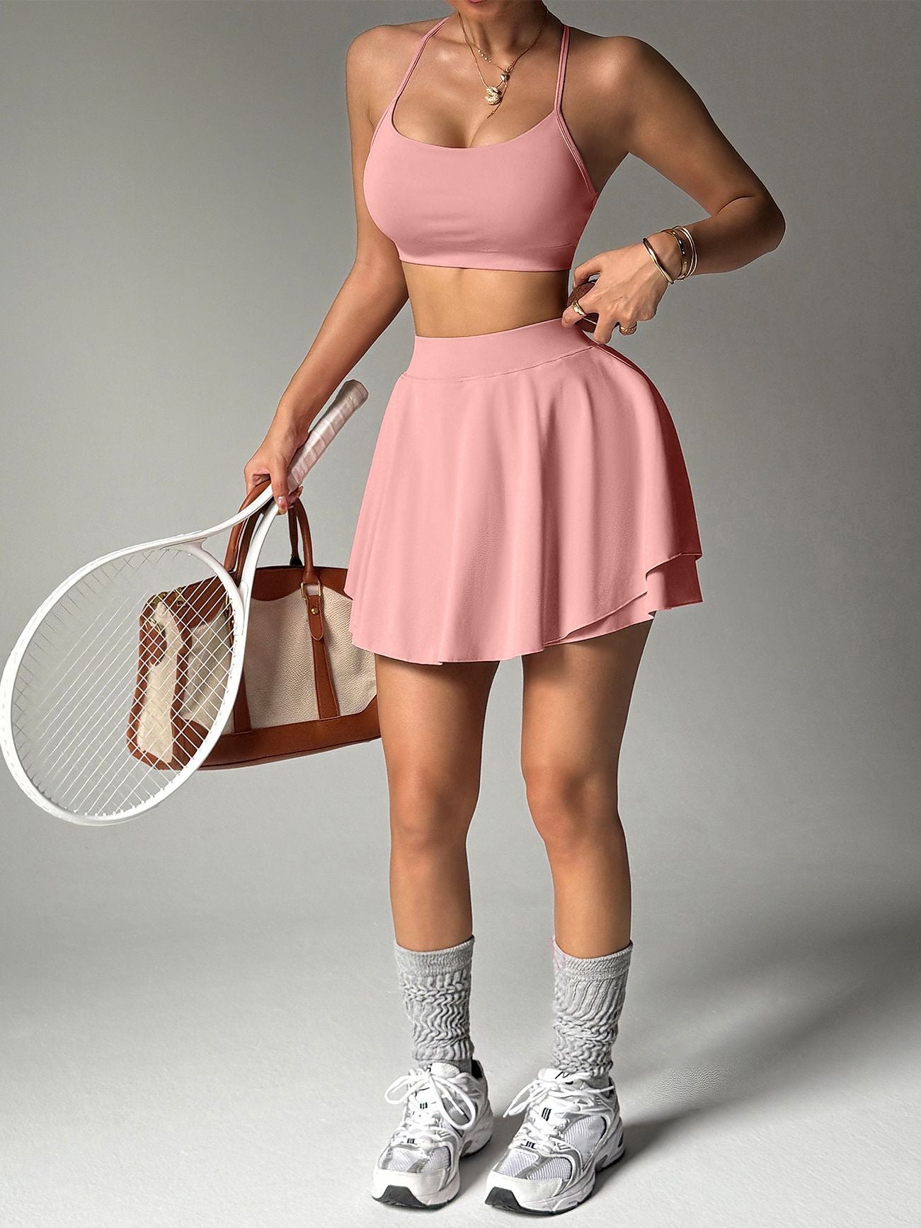 Features: Pleated teenis skirt suit with pocket design